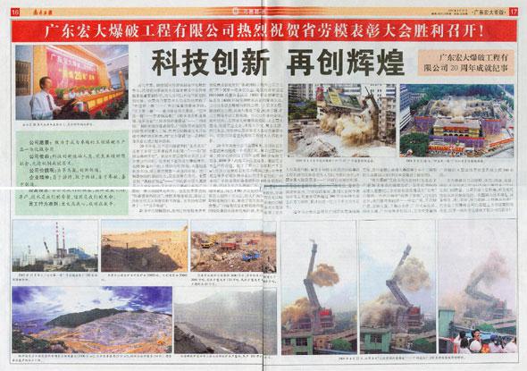 广州体育馆爆破拆除工程(2001年) 工程创新点 创造了当时全国一次爆破面积最大的记录,号称“中国第一爆”。 在国内首先提倡环保清洁拆除爆破,租用2架直升飞机高空洒水除尘。 该爆破史无前例的让中央电视台开辟了现场直播室,并连续15天跟踪报道,吸引了海内外70多家媒体聚集在广州,造成了巨大社会影响。 该...