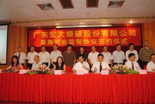 为进一步加强公司与银行的战略合作以及答谢银行对我公司上市工作的支持和帮助,公司于2012年6月29日在亚洲国际大酒店成功举办了“广东宏大爆破股份有限公司募集资金监管协议签约仪式暨上市答谢酒会”。应邀出席仪式的有:广发行广州分行、农行广东省分行营业部、工行广州花城支行、中行广州海珠支行、浦发行广州天誉支行等五家银行的领导及相关人员;广发证券的保荐代表人朱煜起女士;广业公司资金财务部和资金结算中心有关领导和人员。公司董事长兼总经理郑炳旭,党委书记宗粤琦,常务副总经理王永庆,高级顾问李应儒等参加了此次会议。会议由公司执行总经理方健宁主持。