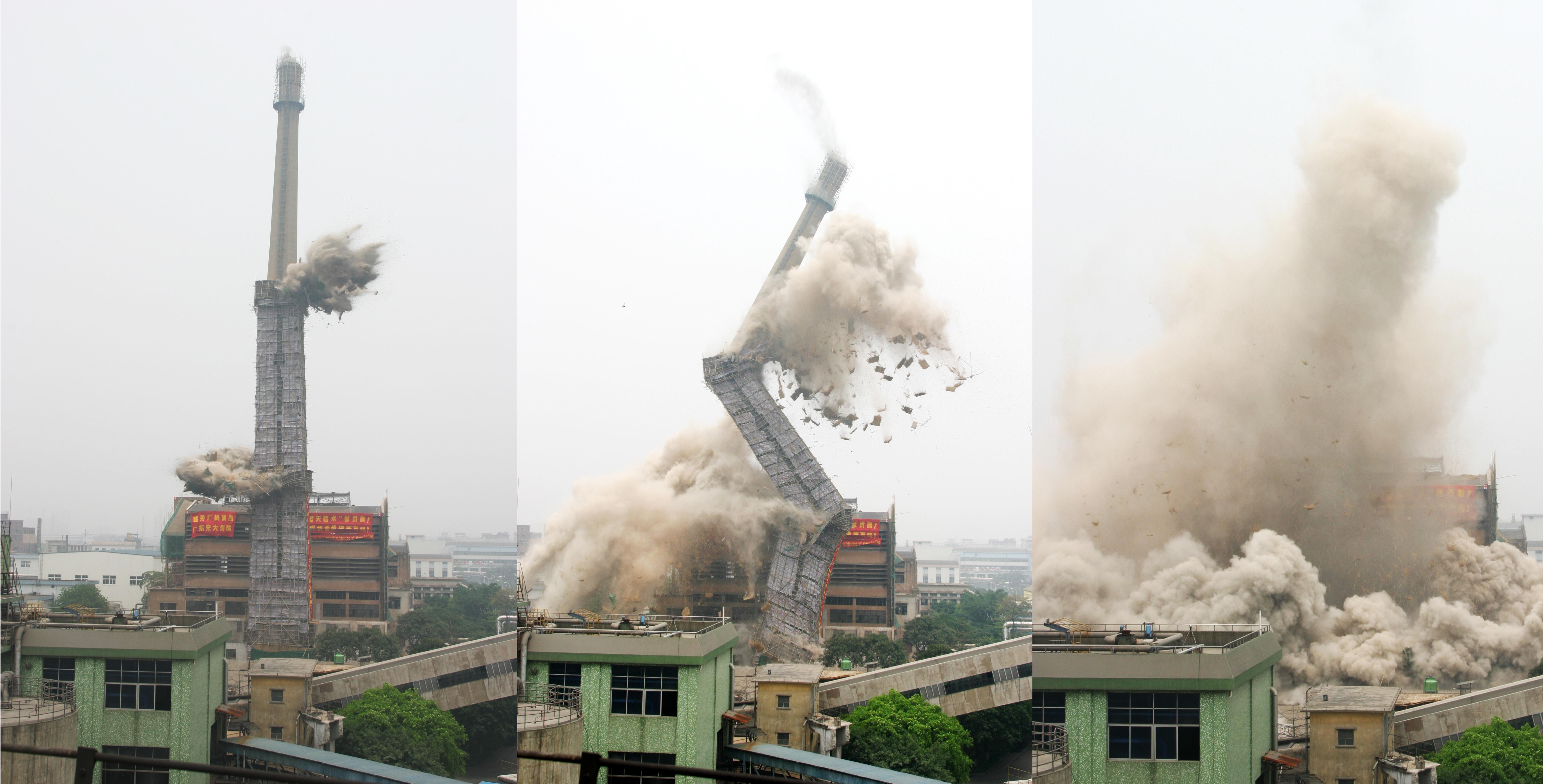 ——三段折叠爆破,演绎爆破艺术 2005年8月,我司成功实施广州造纸厂100米烟囱三折定向爆破拆除技术,在世界爆破史上尚属首例,获得2006年中国工程爆破协会科技进步一等奖。此次工程系统解决了超高建筑的叠拆难题,表明我国在超高建筑拆除基础理论与建设应用方面已完全成熟,宏大所创造的代表中国爆破行业领先水平的应用技术已达到世界领先水平,该技术已获国家技术发明专利证书。 高耸构筑物爆破拆除,九十年代在英国和南非均出现过“反向”倾倒的灾难事故,将自己正在运行的发电厂房拦腰砸断,在我国一直是爆破禁区。为破解这一难题,宏大公司在多年研究基础上,95年承接了茂名石化两座120米烟囱拆除,公司专家团队凭着过硬的理论功底和丰富的施工经验,破除了国内爆破烟囱“十座烟囱九座坐”的咒语,两座烟囱稳稳当当地准确倾倒在设计倒塌中心线上,全国爆破界为之振奋。经过公司专家团队的不断探索,宏大公司继美、俄之后实施了150高烟囱折叠爆破,紧接着又成功实施了世界上首例三折叠定向爆破拆除高烟囱。针对超高建筑拆除---破解超高建筑拆除复杂机理,提升中国爆破行业国际竞争力。