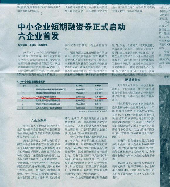 10月9日,中国银行间市场交易商协会正式启动了中小企业发行短期融资券试点,我司成为首批发行短期融资券的6家中小企业之一,公司从准备申报材料,到获得注册通知,仅用了22天时间,预计大约两周之后,公司就可以拿到发行短期融资券募集的3700万元资金,约占公司净资产的40%。