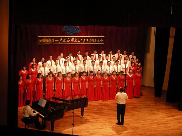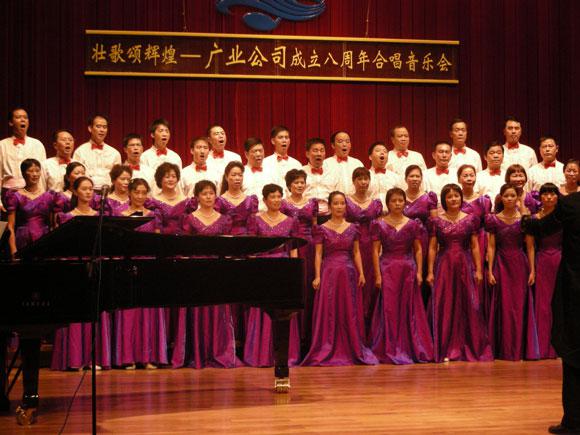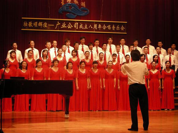 2008年9月23日下午,《壮歌颂辉煌》--广业公司成立八周年暨国庆59周年合唱音乐会以壮丽的歌声,以合唱比赛的形式,在金碧辉煌的星海音乐厅顺利举行。广业公司领导,各一级企业领导班子成员及400多名员工,观看了演出。全系统12个代表队演员人数近500人纷纷登台献艺,一阵阵嘹亮的歌声引起了如潮的掌声,各参赛选手均以自己最美好的歌声,汇合成大合唱,表达对祖国的无限祝福和赞美,整个场面气势恢弘,高潮迭起,演员们声情并茂的演出,博得了观众的阵阵喝彩。
