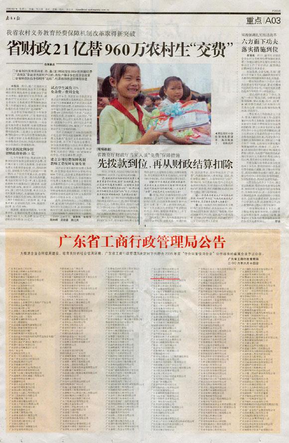 南方日报A03_广东省工商管理局公告_我司连续获得守合同重信用企业称号