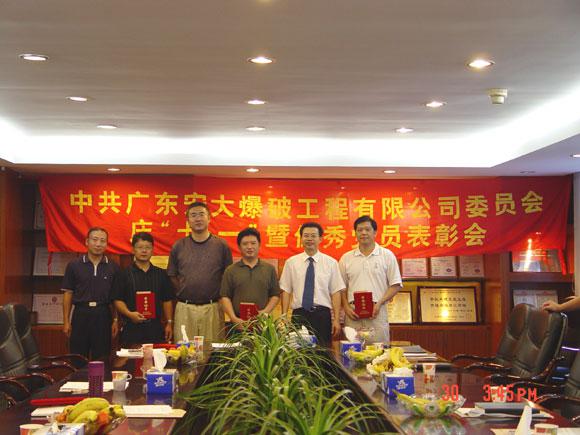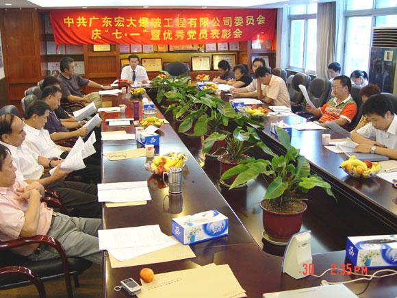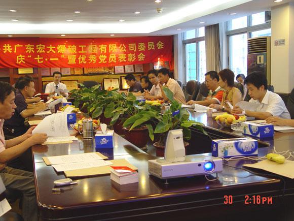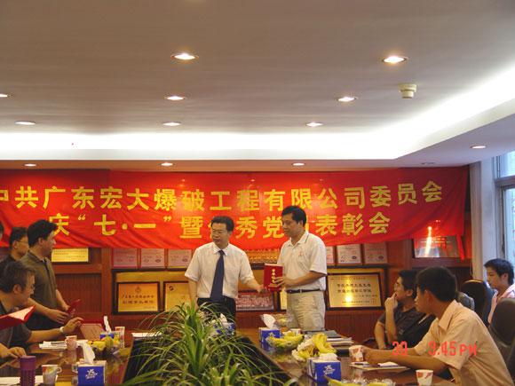 6月30日下午,广东宏大爆破工程有限公司党委召开了庆“七一”暨优秀党员表彰会。会议学习了党务文件(环保产业党[2006]009号和环保产业党[2006]016号)的相关内容,党委书记郑炳旭同志要求全体党员和在职员工要学习丛飞同志,弘扬“丛飞精神”,并结合社会主义荣辱观教育,加强精神文明建设,构建和谐宏大。会议还组织观看了反邪教警示教育电视片,对获得2005年度优秀党员(宏大爆破第一党支部:陈飞,宏大爆破第二党支部:樊运学,宏大广航总部党支部:赖义纯、黄锦雄,宏大广航浚通二党支部:徐明,宏大广航礁炸二党支部:王进)进行了表彰,大会在热烈的祝贺声中结束。