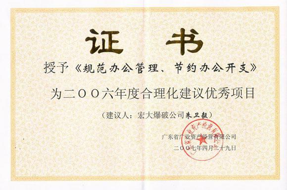 2007年4月29日,在广东省广业资产经营有限公司召开的2006年度先进集体和先进个人表彰大会上,我司郑炳旭总经理、傅建秋总工荣获先进工作者荣誉称号;肖文雄副总经理荣获优秀共产党员荣誉称号。另外,我司递交的《规范办公管理、节约办公开支》建议书还荣获合理化建议优秀项目奖。