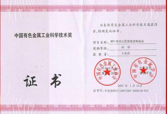 近日,我司申报的《MEF移动式乳胶基质制备站》项目荣获中国有色金属工业协会、中国有色金属学会联合颁发的“中国有色金属工业科学技术奖”二等奖。