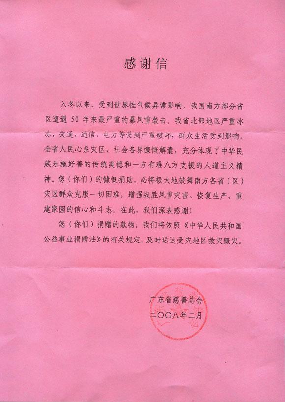 入冬以来,受到世界性气候异常影响,我国南方部分省区遭遇50年来最严重的暴风雪袭击。我省北部地区严重冰冻,交通、电力等受到严重破坏,群众生活受到影响。为确保部分灾民的生产生活,协助省政府做好救援工作,广东省慈善总会从2月2日启动“抗冰雪,送温情”接收各界捐赠行动。