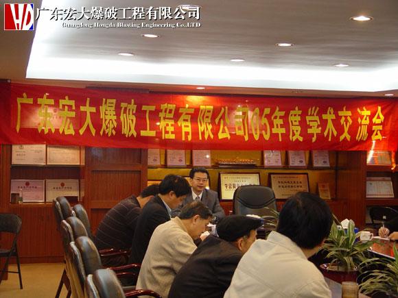 2006年2月18日,在我司五楼会议室召开了广东宏大爆破工程有限公司05年度学术交流会,与会人员包括:郑炳旭董事总经理,王永庆董事副总经理;论文作者傅建秋、肖文雄、唐涛、邢光武、陈飞、李泉、陆芝进、陈培义、陈伟、胡小龙、罗伟涛、周名辉、刘翼、崔晓荣;营销中心部门副职及以上人员,技术总监;运营中心及总工办总部全体成员。