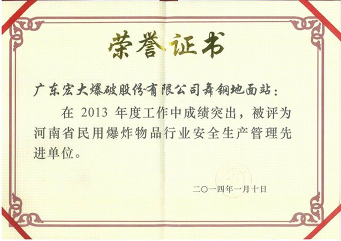 1月13日,在河南省国防科学技术工业局主持召开的2014年全省民用爆炸物品行业安全生产工作会议上,我公司河南舞钢地面站获得2013年度“河南省民用爆炸物品行业安全生产管理先进单位”称号,其中周伟光同志被评为2013年度“河南省民用爆炸物品行业安全生产管理先进工作者”。