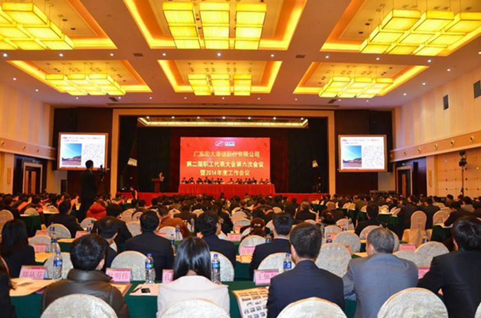 为总结2013年工作,表彰先进,进一步弘扬企业精神,增强员工自豪感和凝聚力,并做好2014年各项工作的部署,1月16日至17日,公司在清远清新花园酒店召开了第二届职工代表大会第六次会议暨2014年度工作会议。本次工作会议由党委副书记宗粤琦(1月16日)、新任执行总经理梁发(1月17日)分别主持。公司领导、本部员工、各事业部、各分子公司代表等400余人参加了会议。会议主要报告了公司2013年经营情况、2014年工作目标与任务、2013年优秀表彰,并分别签订了《经营管理目标责任书》、《党建和党风廉政建设责任书》以及《安全生产责任书》。