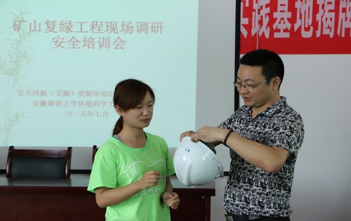 仪式结束后,宏大国源副总经理杨家富,向同学们详细介绍了繁昌县矿山复绿工程现状以及“繁昌模式”的基本情况。随后,为保障调研活动安全平稳进行,宏大国源安环部经理薛国平向同学们做了详细的安全培训。