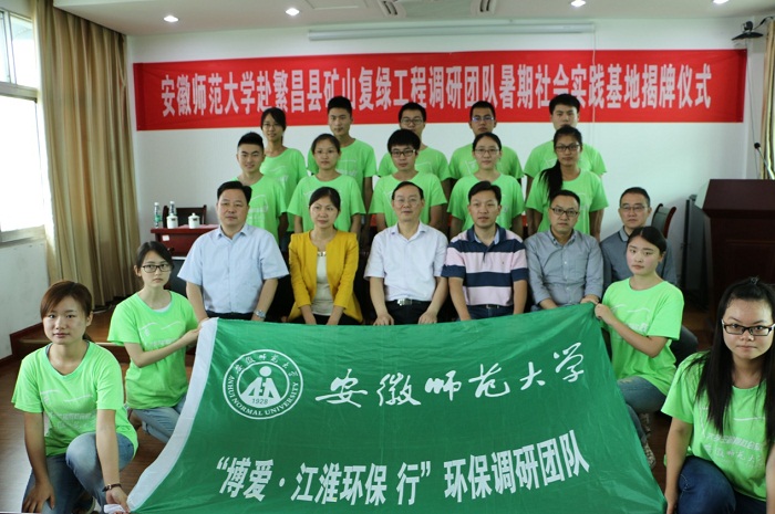 深度合作,创建共赢模式。在揭牌仪式上,副县长马桢烈致辞,他介绍了“美丽繁昌,美好家园”环境专项整治项目,希望以此活动为契机搭建合作平台,为政府决策提供专业意见。杨如意副院长对繁昌县县政府、宏大国源公司给予安师大暑期社会实践的支持表示感谢,并提出希望在繁昌县建设学生专业实习、创新实践示范基地,从而实现双方共赢。吴涤尘董事长,首先欢迎同学们的到来,表示宏大国源将全力做好服务工作,同时,他也提醒同学们要注意实践期间的安全。随后,滕德宝局长与杨友谊副书记一起为“博爱,江淮环保行”环保调研团队暑期社会实践基地揭牌。