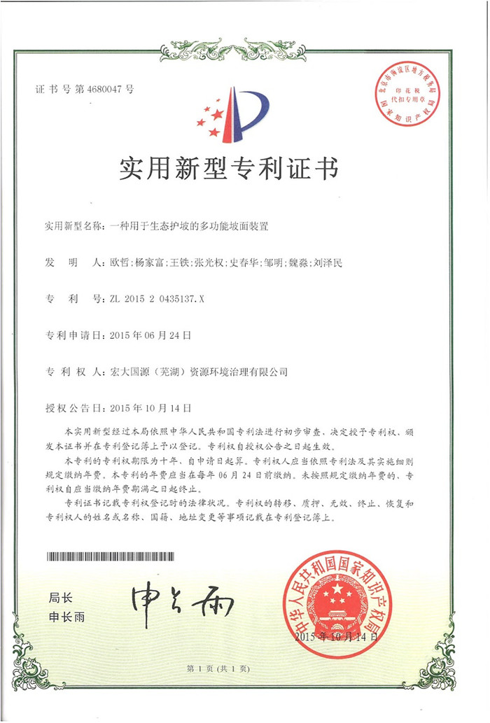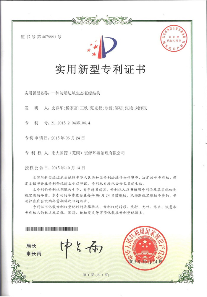 近日,广东宏大爆破股份有限公司控股子公司:宏大国源(芜湖)资源环境治理有限公司(以下简称:宏大国源)又传喜讯:“一种可升降的半自动坡面拦石装置” 获得发明专利; “一种陡峭边坡生态复绿结构”和“一种用于生态护坡的多功能坡面装置” 获得实用新型专利。其中,发明专利在不增加额外费用的情况下,从申请到拿证仅用了1年的时间,较常规时间提前了1~2年,这反映了宏大国源的技术创新已经在同行业达到了领先水平。