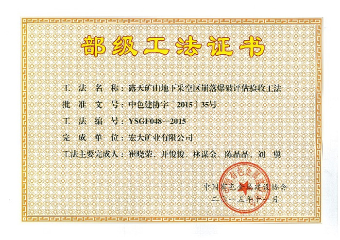 此项成果的获得是对我公司先进施工经验的肯定和鼓励。宏大矿业历来重视工法研究、开发、总结和推广应用工作,注重以工法开发增强企业科技创新能力,鼓励员工积极采用新技术、新工艺、新材料和新设备,不断提高施工技术水平和工程质量。