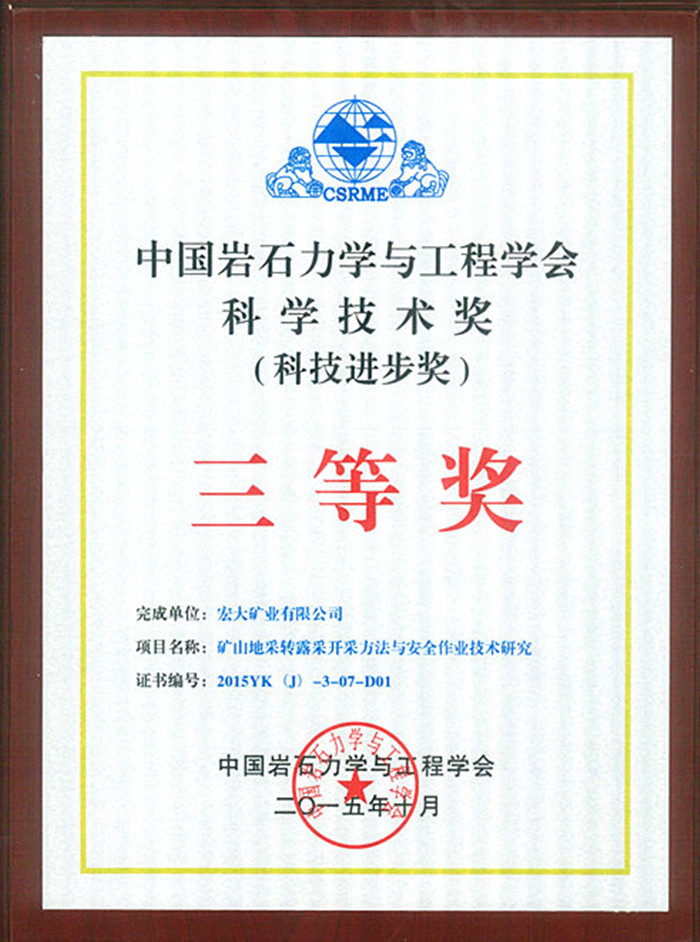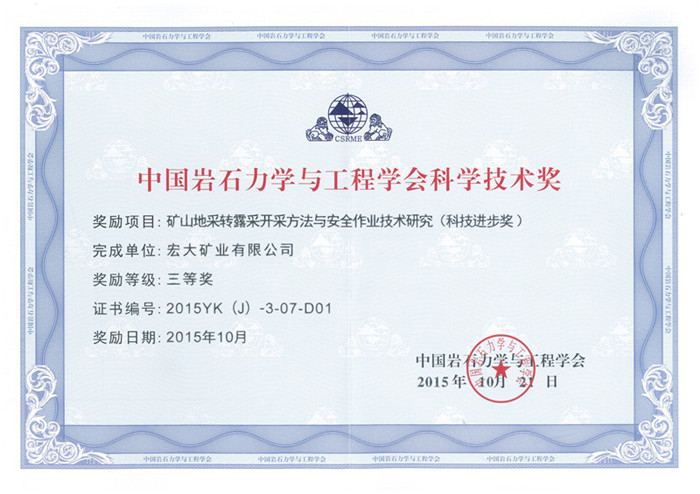 中国岩石力学与工程学会科学技术奖是经中华人民共和国科学技术部批准设立的,专门奖励在岩石力学与工程中做出突出贡献的科技人员和单位。此荣誉的获得是我公司全体员工共同努力的成果,也是我公司技术实力的象征,为一线的安全生产提供了技术保证。不仅如此,此奖项的获得,对公司核心竞争力的提升、未来高新技术企业申请、对外项目拓展等工作都具有重大意义。