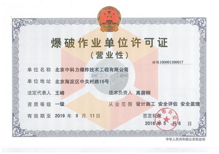 随着公司爆破资质有效期的临近,公司领导高度重视并组织资质申报小组完成了爆破作业单位营业性资质申报资料的收集、组卷工作,形成正式申报材料报送北京市公安局。4月20日北京市公安局组织专家组进行实地考察和严格审核后,确定中科力各项指标均达到营业性爆破作业单位一级资质标准。该资质使得公司具备了A级爆破设计施工、安全评估、安全监理作业资格,为公司进一步提升对外投标能力,拓展爆破作业施工新领域奠定了基础。