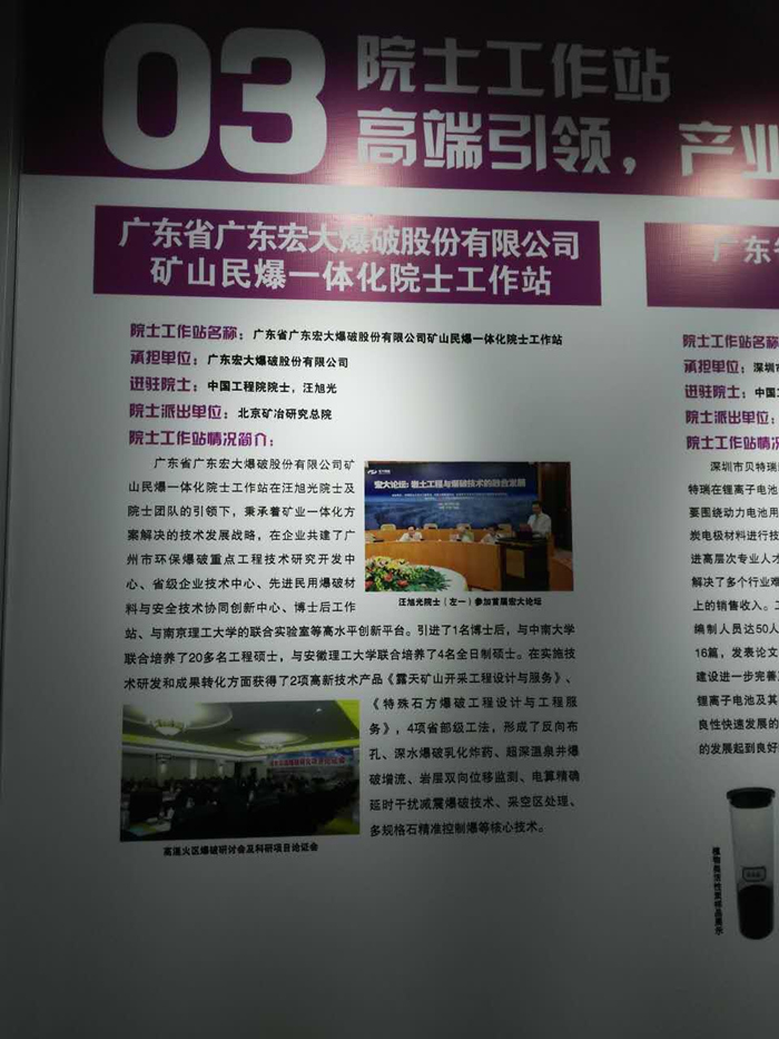 宏大爆破“矿山民爆一体化院士工作站”,于2014年经广东省科技厅批准立项并资助100万元。目前,广东省共资助建设院士工作站121家,主要涉及先进制造、高端装备、新材料、电子信息、生物医药等领域。本次会展,省科技厅从121家院士工作站中选拔出10家参展,大多数属于新兴行业,宏大爆破院士工作站是唯一一家传统行业企业,显得弥足珍贵。