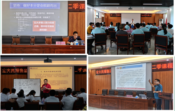 9月11-13日,学员们在《宏大追梦人》的嘹亮歌声中,开始紧张的一天学习课程。中华礼仪文化传播者郑懿珊老师讲述《礼遇人生——商务礼仪培训》,细致全面的解读职场礼仪、商务拜访等内容,组织实战演练,学以致用。刘根生博士以《如何成为组织需要的人才》为课题授课,令学员进一步明晰职业生涯规划,提升竞争力,快速调整人才成长亚健康状态。赵洱岽教授在《高效管理沟通》授课中,以幽默风趣的语言、丰富生动的案例,逐一解读沟通认知、评价、类型、差异化沟通等方面,令学员在满堂笑声中收获知识。公司总工程师李国亮讲授《中国民爆100年》,系统梳理了中国民爆历史发展进程及未来发展趋势,鼓舞昨日有志青年早日蜕变为今日公司精英,争当明日行业尖兵。公司副总经理张忠亲切分享了个人发展经历,讲授《安全管理》,深入浅出的阐释了安全的本质、管理手段、标准化建设等知识及运用,激发学员学习内驱力。