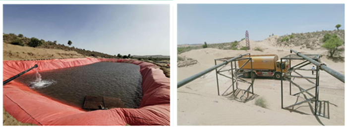 临建设施陆续建立,人员、设备、物资终于可以入场,项目部开始正常施工。没想到,又遇到了沙地陷车、沙尘暴、道路维护缺水等困难。于是,大家想出了好办法,自己搭建搭建自流加水站,解决现场道路维护缺水问题。