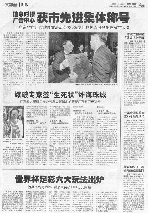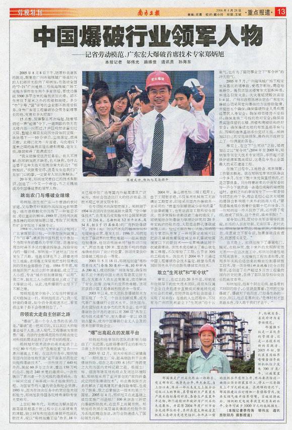2006年4月26日,南方电视台、广州电台、信息时报等多家媒体来我司对2006年度 “广东省劳动模范”——郑炳旭总经理进行了专访。 郑炳旭总经理欣然接受了媒体采访,并表示将继续发挥劳模的先锋模范作用,不辜负党和人民的期望,把公司做强做大,使“宏大爆破、爆破专家”的品牌响彻全中国。