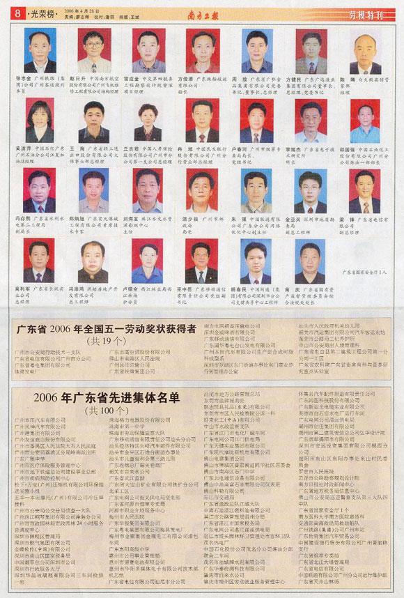 2006年4月28日,我司郑炳旭总经理、王永庆副总经理出席广业公司2005年度先进集体、先进个人颁奖大会。 郑炳旭总经理荣获广东省广业资产经营有限公司2005年度“特殊贡献优秀职工”,并代表广业公司“先进个人”、“特殊贡献优秀职工”宣读倡议书。 王永庆副总经理荣获广东省广业资产经营有限公司2005年度“先进个人”奖。 &n...